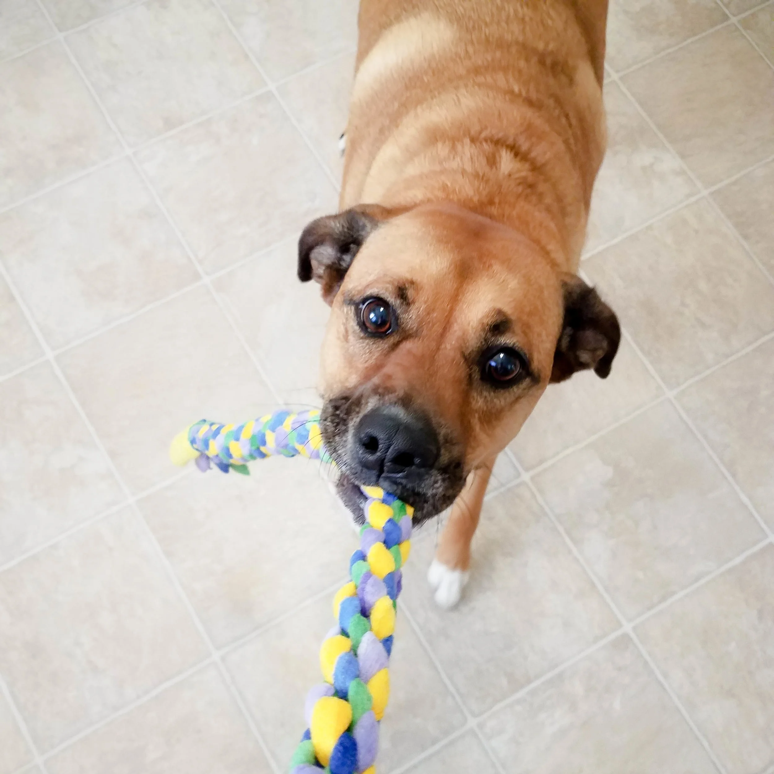 One of my favorite things about this tug toy is that even after they tore it in half, it didn't completely fall apart because of how it's knotted. We would just tie off the end and keep going. Works MUCH better than a braid! And I loved the square-knot shape.